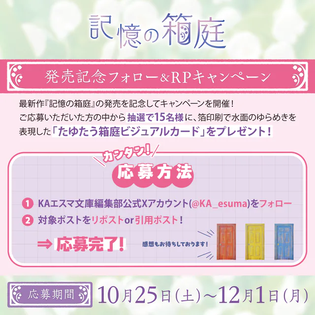 KAエスマ文庫『記憶の箱庭』の発売を記念して、KAエスマ文庫編集部の公式Xアカウントにてキャンペーンを開催いたします!